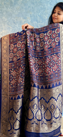 INDIGO DOLA SILK AJRAKH HANDBLOCK PRINT SARI WITH BANARASI BORDERS AND BEAUTIFUL ZARI PALLA .