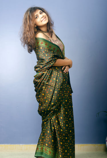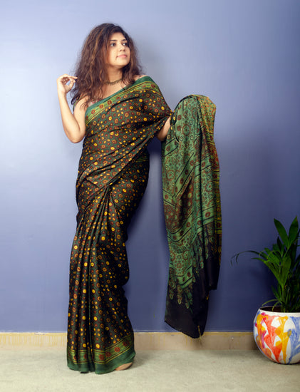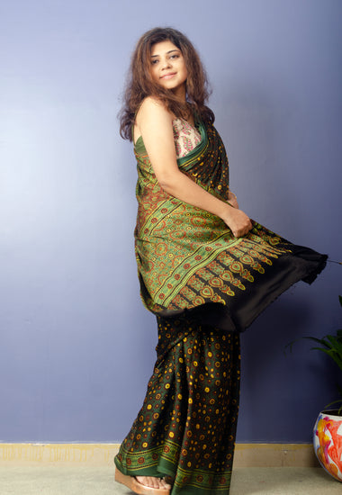 AJRAK BLOCK PRINTED MODAL SILK SARI IN DARK GREEN