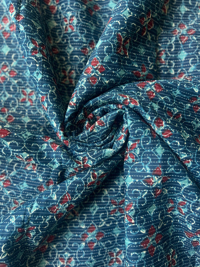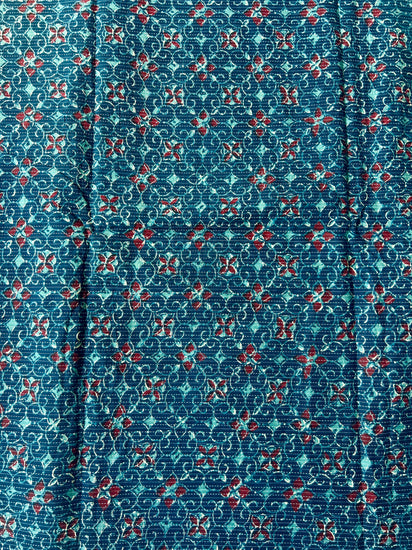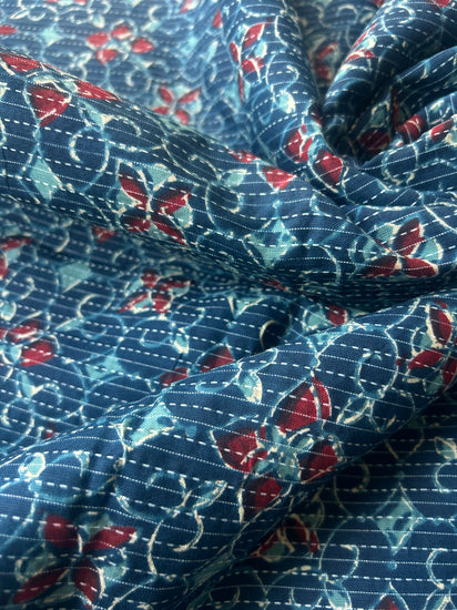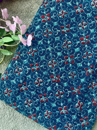 Prussian Ajrakh Print with kantha stitch on Cotton Fabric