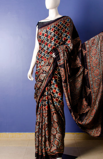 BEAUTIFUL AJRAK BLOCK PRINTED SARI IN BLACK BASE WITH MULTI COLOUR NATURAL DYE