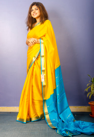 Beautiful yellow with blue Pallu and golden border crepe silk Sari