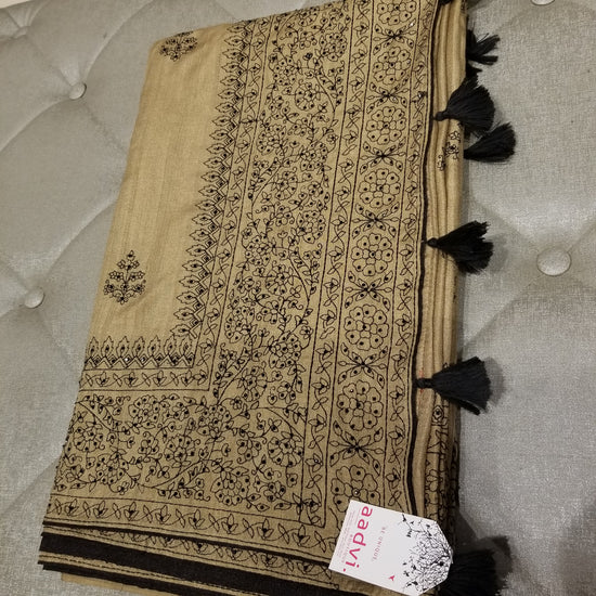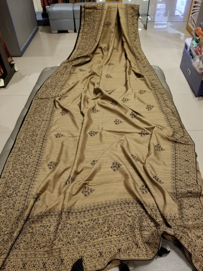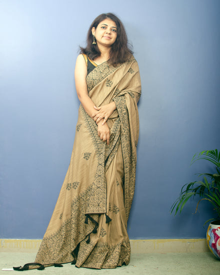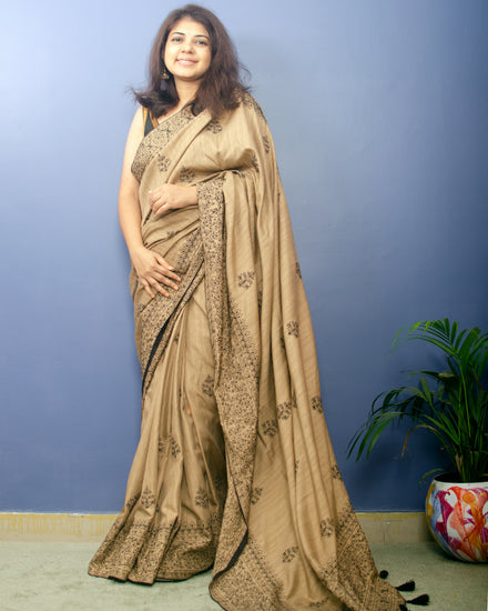 Beige Color Blended Silk Sari with Threadwork and black rhinestone