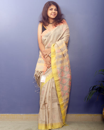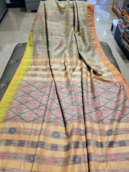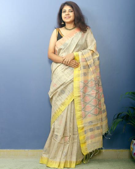Beige Handwoven Tussar Silk with two shades of border