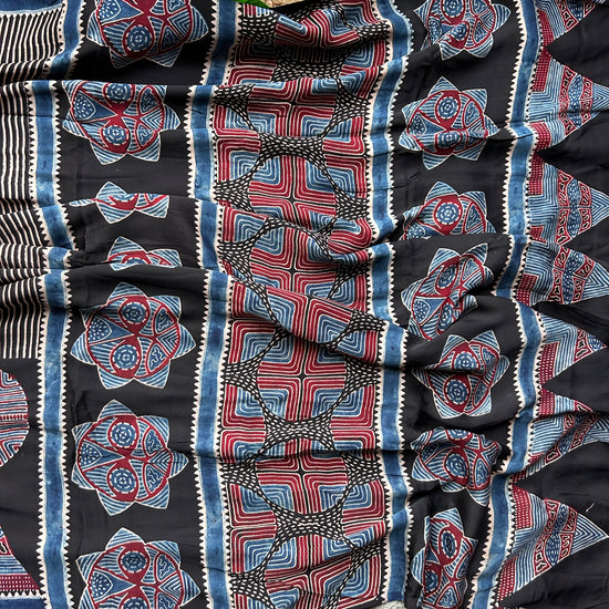 BLACK MULTICOLOR MODAL SILK AJRAKH HANDBLOCK PRINT SARI WITH UNIQUE PATTERN ON BORDERS AND BEAUTIFUL PALLA , ACCESSORISED WITH TASSLES.