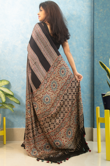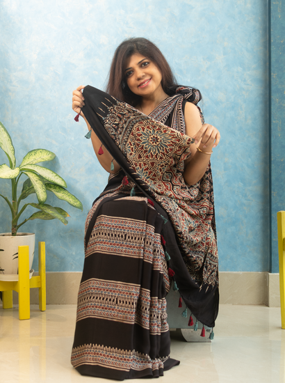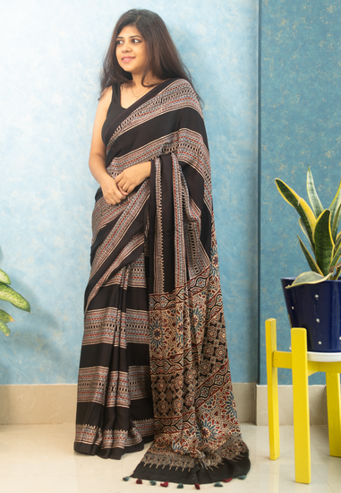 BLACK MODAL SILK AJRAKH HANDBLOCK PRINT SARI WITH BEAUTIFUL PALLA , ACCESSORISED WITH TASSLES.