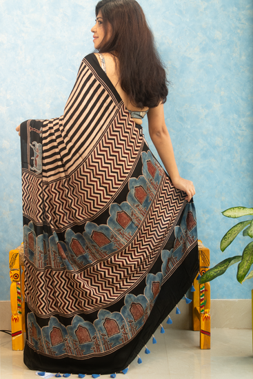 BLACK & BEIGE STRIPES MODAL SILK AJRAKH HANDBLOCK PRINT SARI WITH BEAUTIFUL MULTICOLOR PALLA , ACCESSORISED WITH TASSLES.