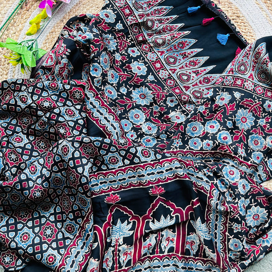 BLACK MULTICOLOR MODAL SILK AJRAKH HANDBLOCK PRINT SARI WITH UNIQUE PATTERN ON BORDERS AND BEAUTIFUL PALLA , ACCESSORISED WITH TASSLES.