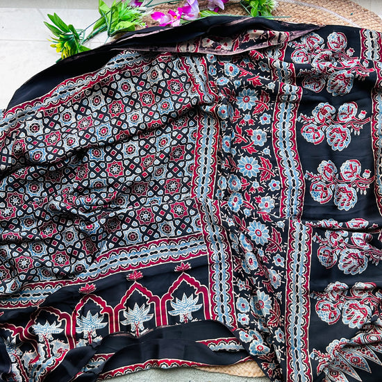 BLACK AJRAK BLOCK PRINTED MODAL SILK SARI