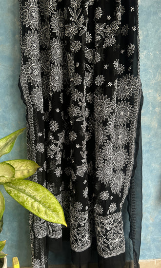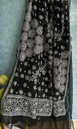 The alluring black Georgette saree weaved with white cotton thread. The fabric is lightweight and soft, best for any season use.