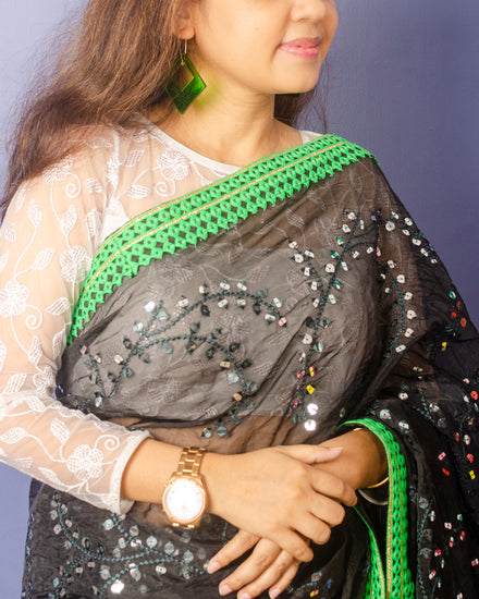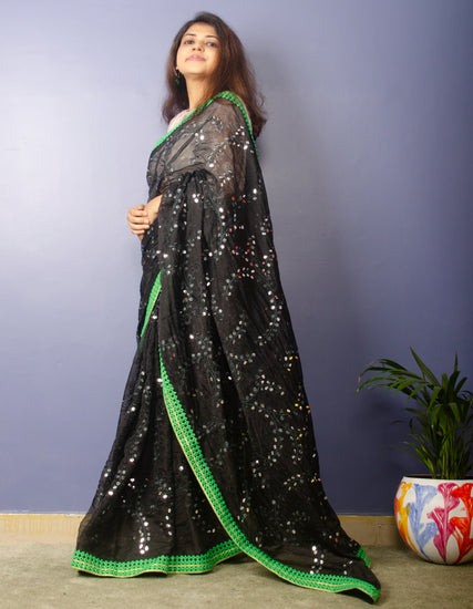 Black Orangaza Saree with paper mirror and thread embroidery Work.
