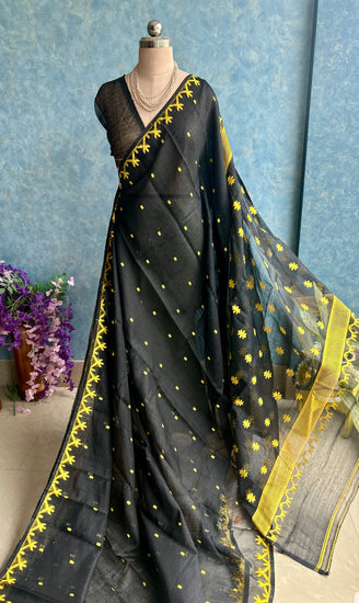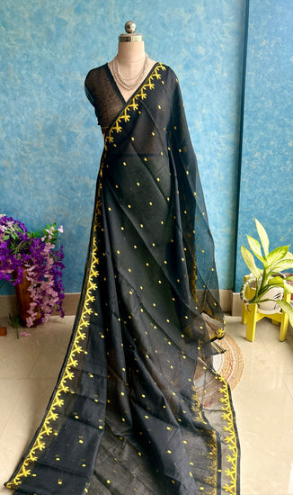 A very beautiful soft Jamdani Saree in black yellow color with Resham butas all over.