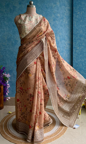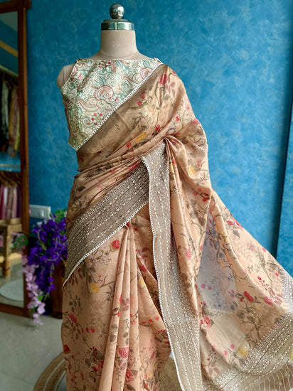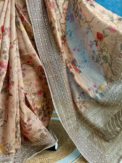 Beautiful digital printed chanderi sari with chikankari work on borders and highlighted the prints with kantha stitch.