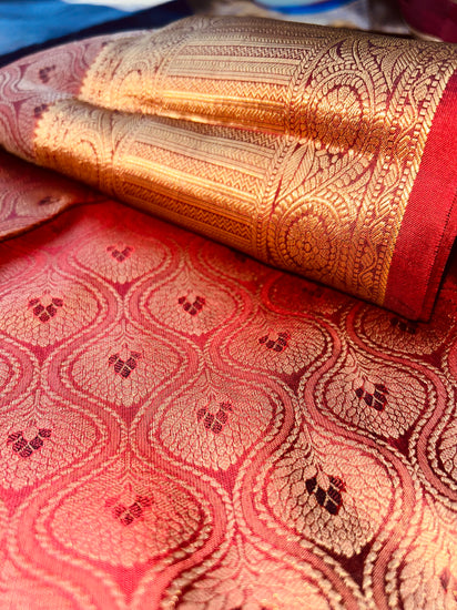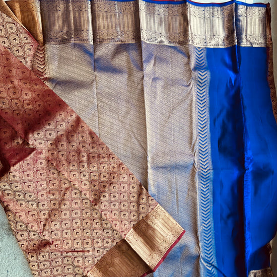 An exquisite Kanchipuram bridal silk saree in a timeless burgundy , graced with tested zari woven motifs all over. The border is crafted from silk, featuring both woven and zari intricacies. The pallu elegantly reflects the same blue and gold palette, enriched with woven and zari designs. This saree is paired with an 90 cm unstitched silk blouse in royal blue, outlined with a shimmering gold zari border.
