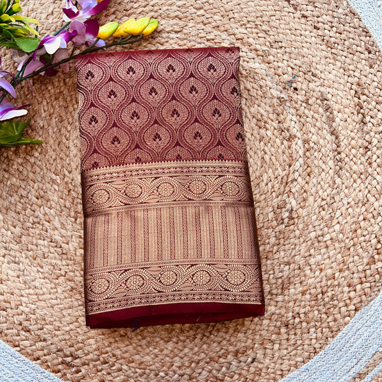 Burgundy Kanchipuram Silk Saree with Zari Buta on the body and Zari Border. Includes unstitched blouse.