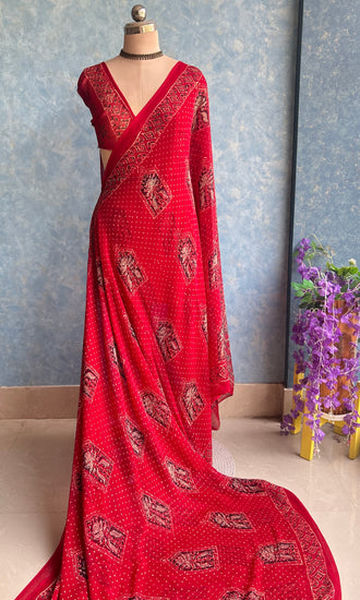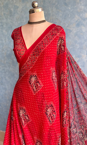 Red Chiffon Handblock Printed Saree