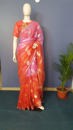 Pink Orange Shaded Organza Sari With Silver Zari Work