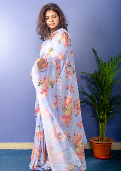 Periwinkle Georgette Sari with Floral Digital Print and Sequence Work.
