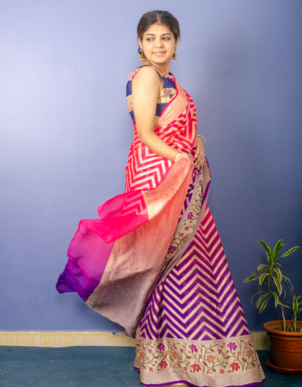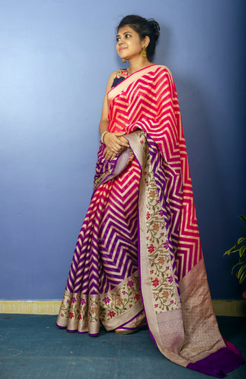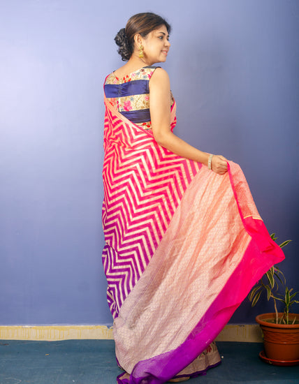 Pink Violet Shades of Pure Chiffon Banarasi Sari with Minakari Borders.