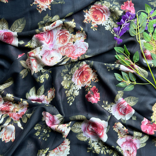 Vintage floral printed on pure crepe chiffon saree. So light weight and easy to drape. Perfect for evening party.