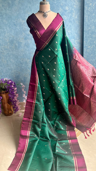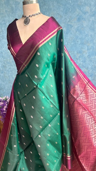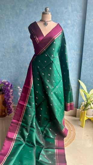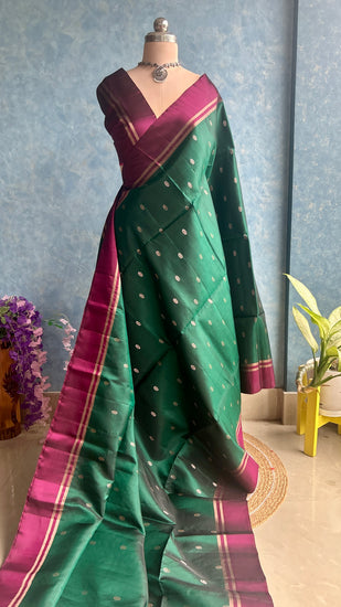 Deep Green Kanchipuram Silk Saree with Zari Buta on the body with contrast border. Includes unstitched blouse.