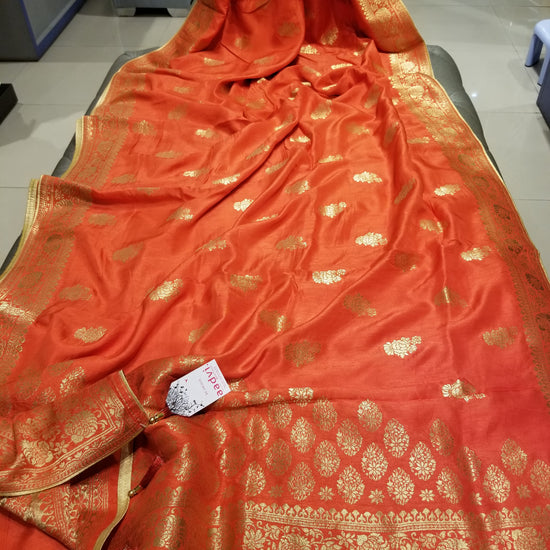 Deep Pastel Orange Crepe Marble Silk Handwoven Sari with intricate golden floral motif all-over work