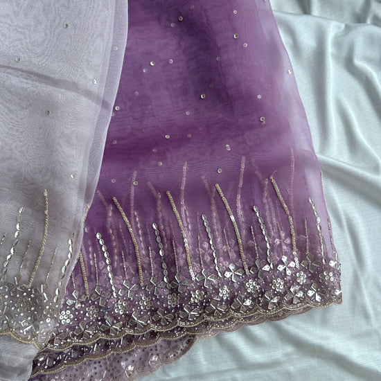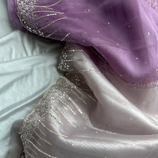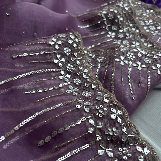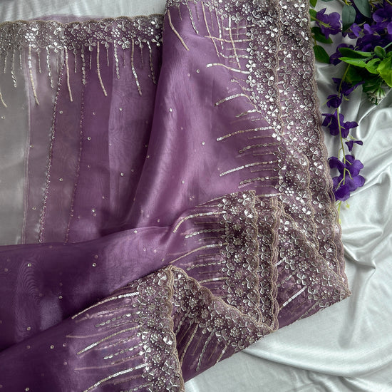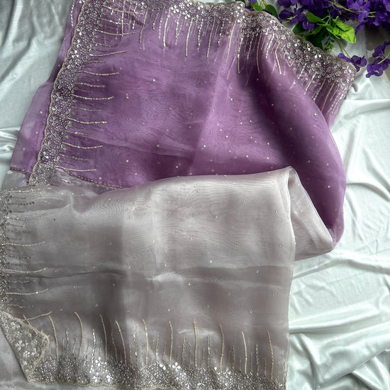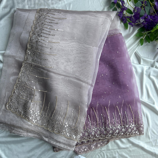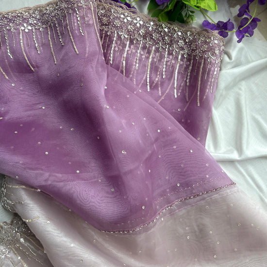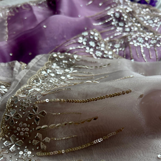 Mauve and Perl Colour Hand Embroidery on Organza Sari