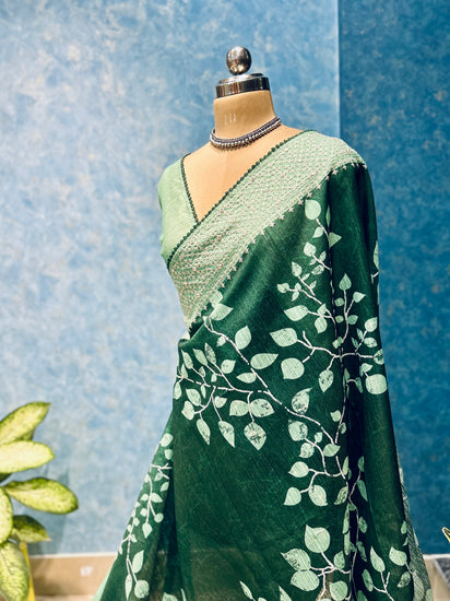Leaf Print on Pine Color Cotton Silk Saree with beautiful embroidered border