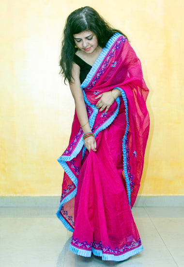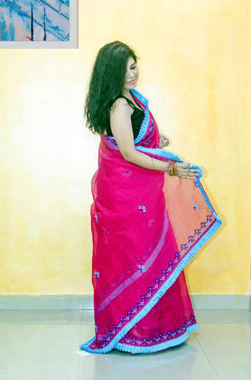 Embroidery on Pink Cotton Silk Sari with Frill