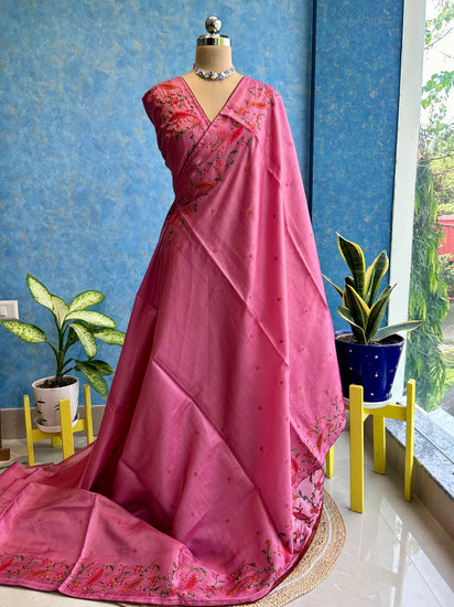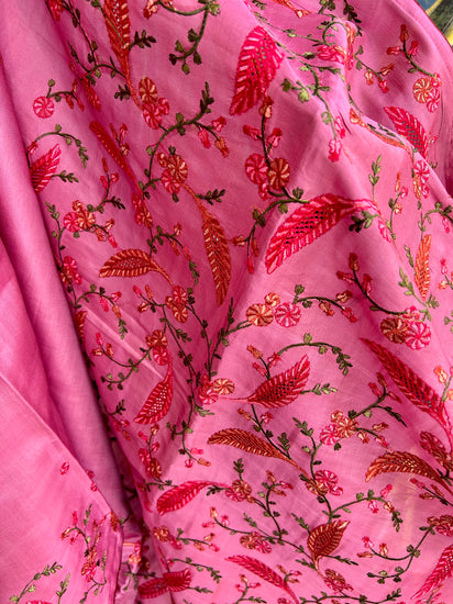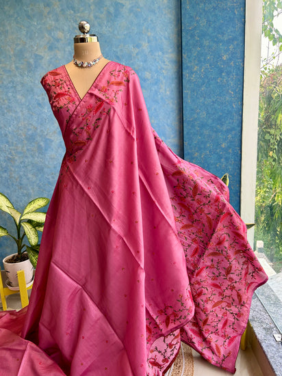 Flamingo Color noel tusser Silk Saree with beautiful cutwork embroidery over body with Kashmiri stitch