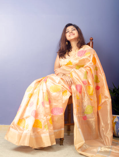 Flossy - Peach Color Chanderi Handwoven Pure Silk by Silk Sari with Multicolor motifs