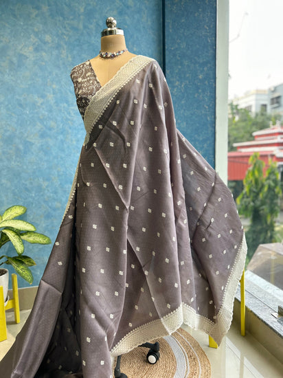Graphite Grey Mulbery Silk Saree with beautiful embroidery border and buta all over body.