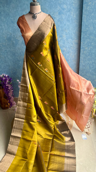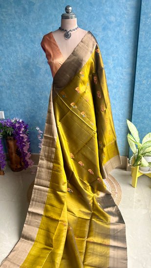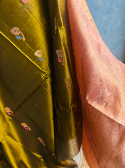 Green Tea Kanchipuram Silk Saree with Zari Buta on the body . Includes unstitched blouse.