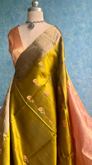 An exquisite Kanchipuram bridal silk saree in a timeless pastel shades , graced with tested zari woven motifs all over. The border is crafted from silk, featuring both woven and zari intricacies. The pallu elegantly reflects the gold palette, enriched with woven and zari designs. This saree is paired with an 90 cm unstitched silk blouse , outlined with a shimmering gold zari border.