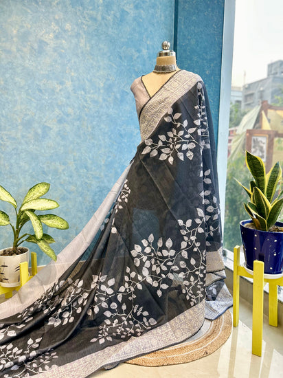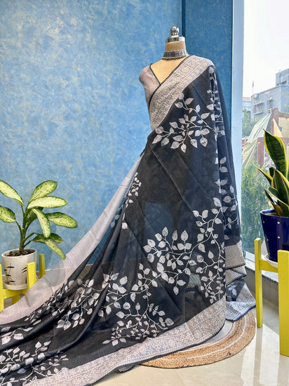 Leaf Print on Dark Grey Color Cotton Silk Saree with beautiful embroidered border