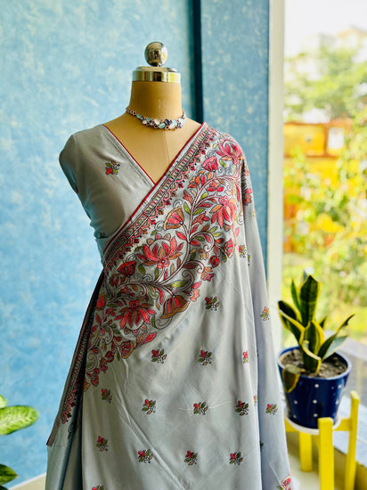 Silver Grey Color Semi Silk Saree with beautiful embroidery border and buta all over body.