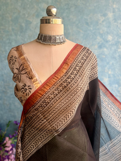 Black and Beige Beautiful Natural Dyed Hand block Printed Kota Doriya Sari with Blouse pc