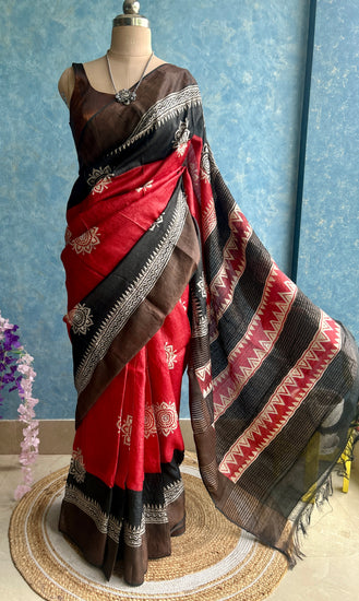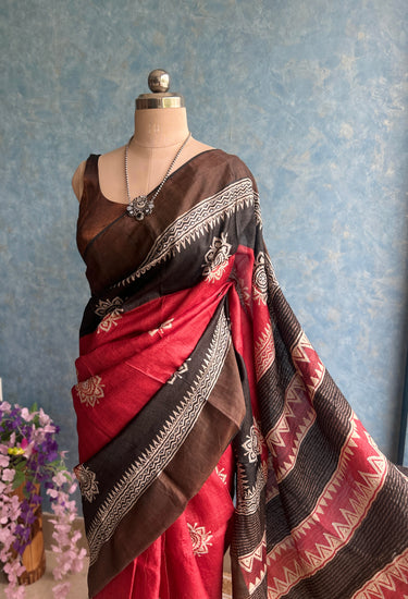 Red Black Handblock With Hand Embroidery on Pure Tussar Silk