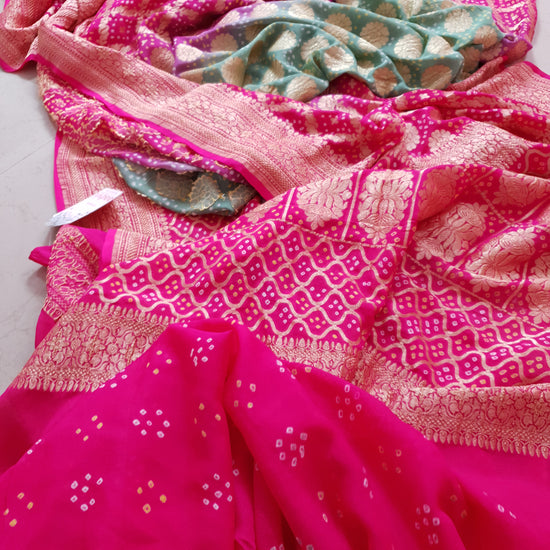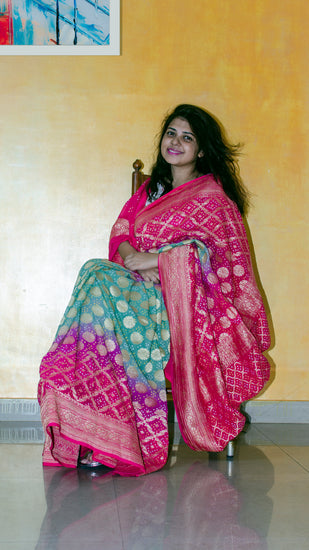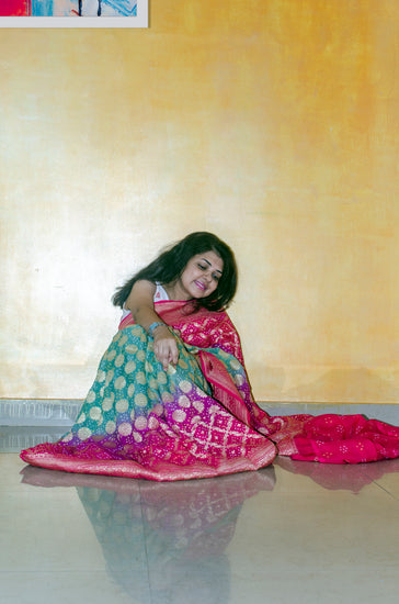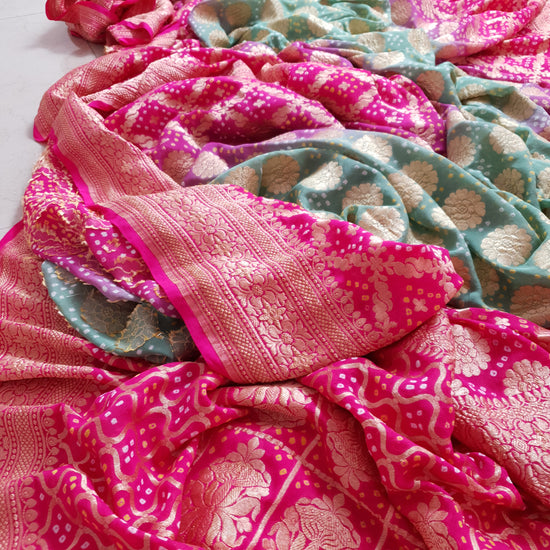 Handwoven Pure Bandhej Sari in tones of Pink, Coral and Sage Green. Ideal for PartyWear.