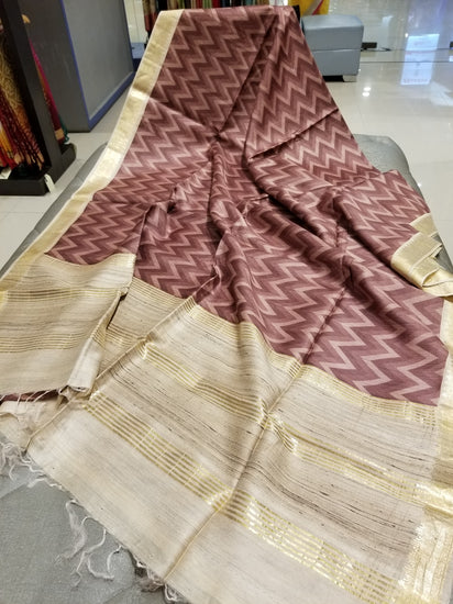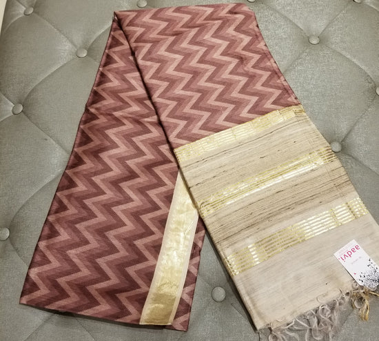 Handwoven Pure Muga Silk Sari in Wine Color with Zig-zag pattern