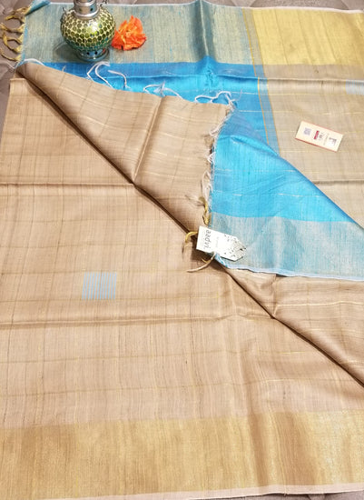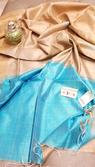 Pure tussar silk sari in beautiful base color, handwoven with sky blue pallu
