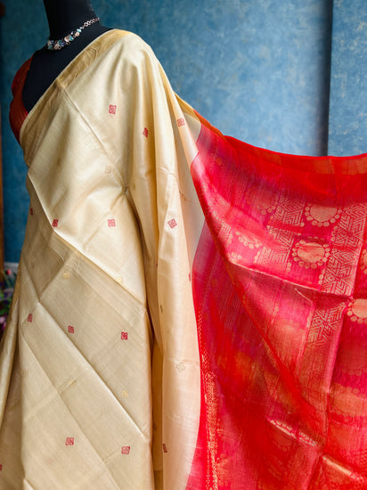 Exclusive handwoven Tusser Silk saree with zari work on contrast Pallu.
