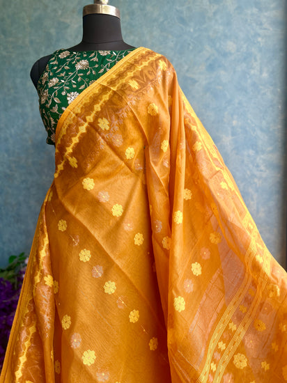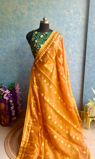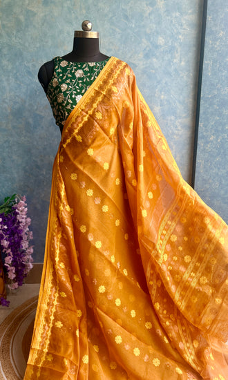 A very beautiful soft Jamdani Saree in honey mustard color with Resham and Zari butas all over.