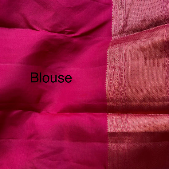 An exquisite Kanchipuram bridal silk saree in a timeless peachy maroon , graced with tested zari woven motifs all over. The border is crafted from silk, featuring both woven and zari intricacies. The pallu elegantly reflects the same gold palette, enriched with woven and zari designs. This saree is paired with an 90 cm unstitched silk blouse in maroon, outlined with a shimmering gold zari border.