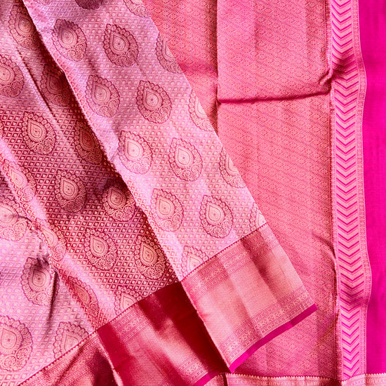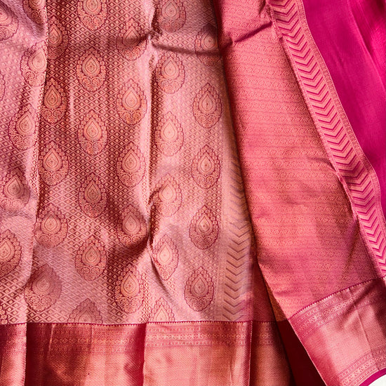 Peachy maroon Kanchipuram Silk Saree with Zari Buta on the body and Zari Border. Includes unstitched blouse.
