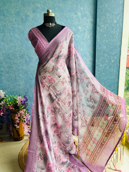 Lavender Linen Digital Print Sari in Pastel Hue with Kantha stitch all over the saree