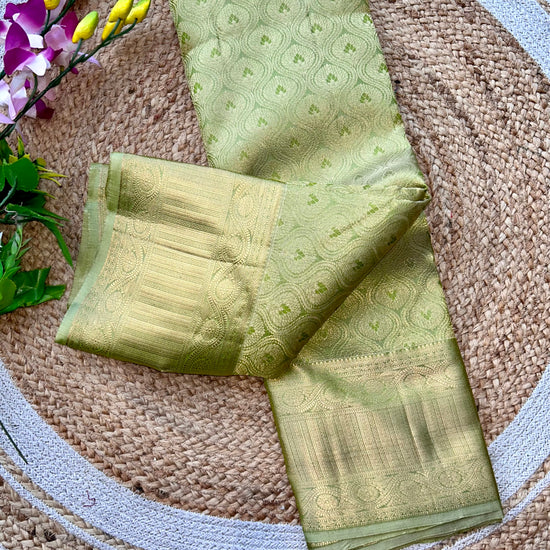 Lime green Kanchipuram Silk Saree with Zari Buta on the body and Zari Border. Includes unstitched blouse.