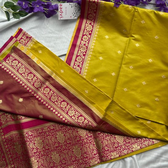 Embrace traditional Indian fashion with a modern twist in this stunning Lovely dual tone lemon yellow Soft Silk Saree. The soft silk fabric is light and breathable, ensuring all-day comfort. The intricate design and delicate embellishments exude grace and finesse, making it a standout piece in your collection.