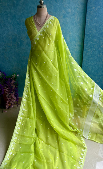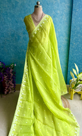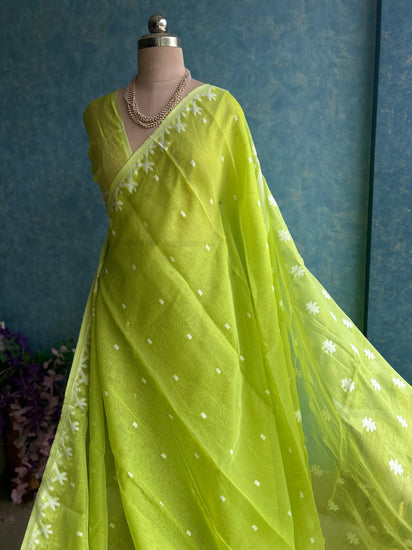 A very beautiful soft Jamdani Saree lime and white combination with Resham butas all over.