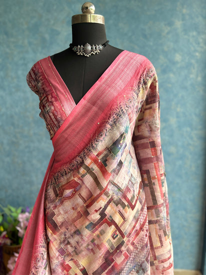 Multi Colour on Grey base Linen Digital Print Sari in Pastel Hue with Kantha stitch all over the saree
