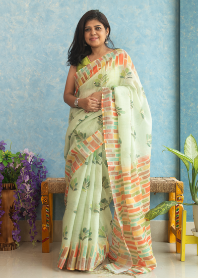 Linen Digital Floral Print Sari in Pastel Hue with Kantha stitch all over the saree